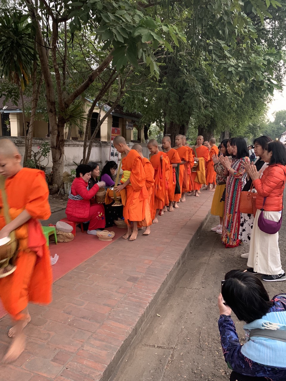 “Một trong những trải nghiệm thú vị của tôi khi đến cố đô Luang Prabang là xem nghi lễ khất thực "Tak Bak" truyền thống của các nhà sư. Các nhà sư đi bộ quanh thị trấn thành một hàng, mang theo bát khất thực. Lễ vật người dân dâng các vị sư gồm xôi, trái cây hoặc các món ăn nhẹ truyền thống.” - Cô Bình chia sẻ cùng Vietlike.