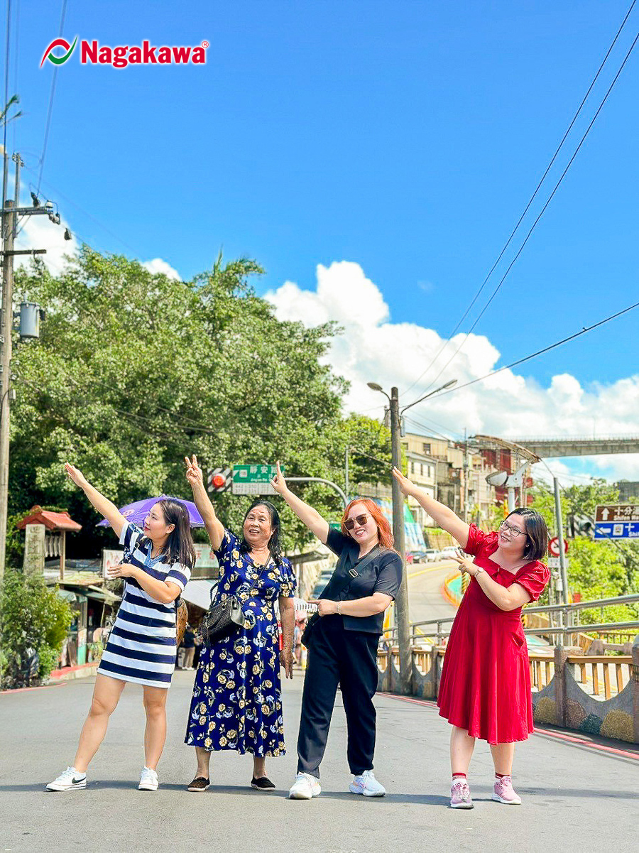 Đoàn Nagakawa chụp ảnh lưu niệm tại Phố cổ Thập Phần - địa điểm văn hóa lịch sử nổi tiếng của Đài Loan, sau khi tham quan Tháp 101 tầng hiện đại, mãn nhãn