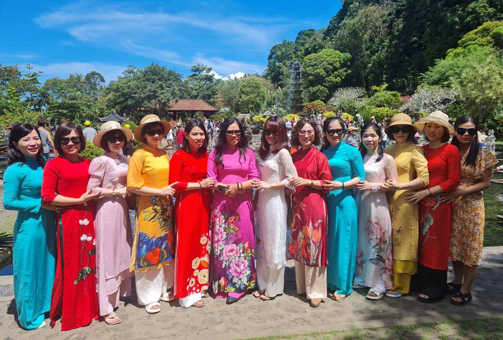 Các chị em trong đoàn thích thú lưu giữ lại hình ảnh chiếc áo dài Việt Nam tại Bali