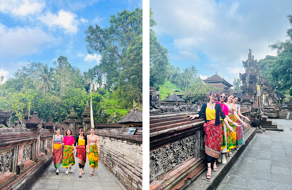 Đoàn chụp ảnh lưu niệm tại Đền Tirta Empul với những chiếc sarong rực rỡ sắc màu đặc trưng