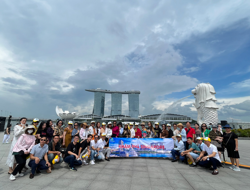 HDV Vietlike Travel chụp ảnh lưu niệm cho đoàn tại khu vực Công viên sư tử biển Merlion - biểu tượng độc đáo không thể bỏ qua khi đến Singapore